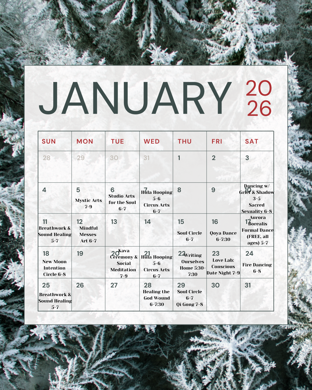 Our fabulous roster of January classes is shown below. To view or register for any class or event, create a login at this link.